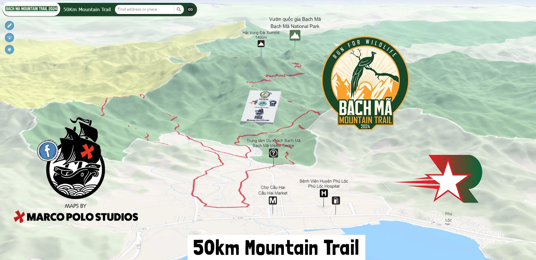 Interactive 3D Maps designed to communicate with runners about the Start/Finish Line, Race HQ, 10km/33km/50km Race Routes, Km Posts, Aid Stations, Water Stations, Street Names, Sponsor Ads, Social Media Links, and provide a bird’s eye view of Bạch Mã National Park.
