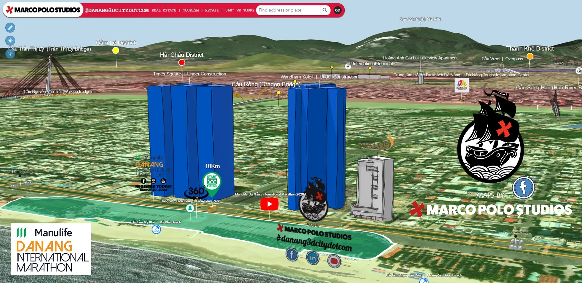 Interactive 3D Map designed to communicate with 9000+ runners about the Start/Finish Line, Race HQ, 10Km Race Route, Km Posts, Aid Stations, Street Names, 360° VR Tour, Sponsor Ads, Social Media Links, and provide a bird’s eye view of Đà Nẵng.
